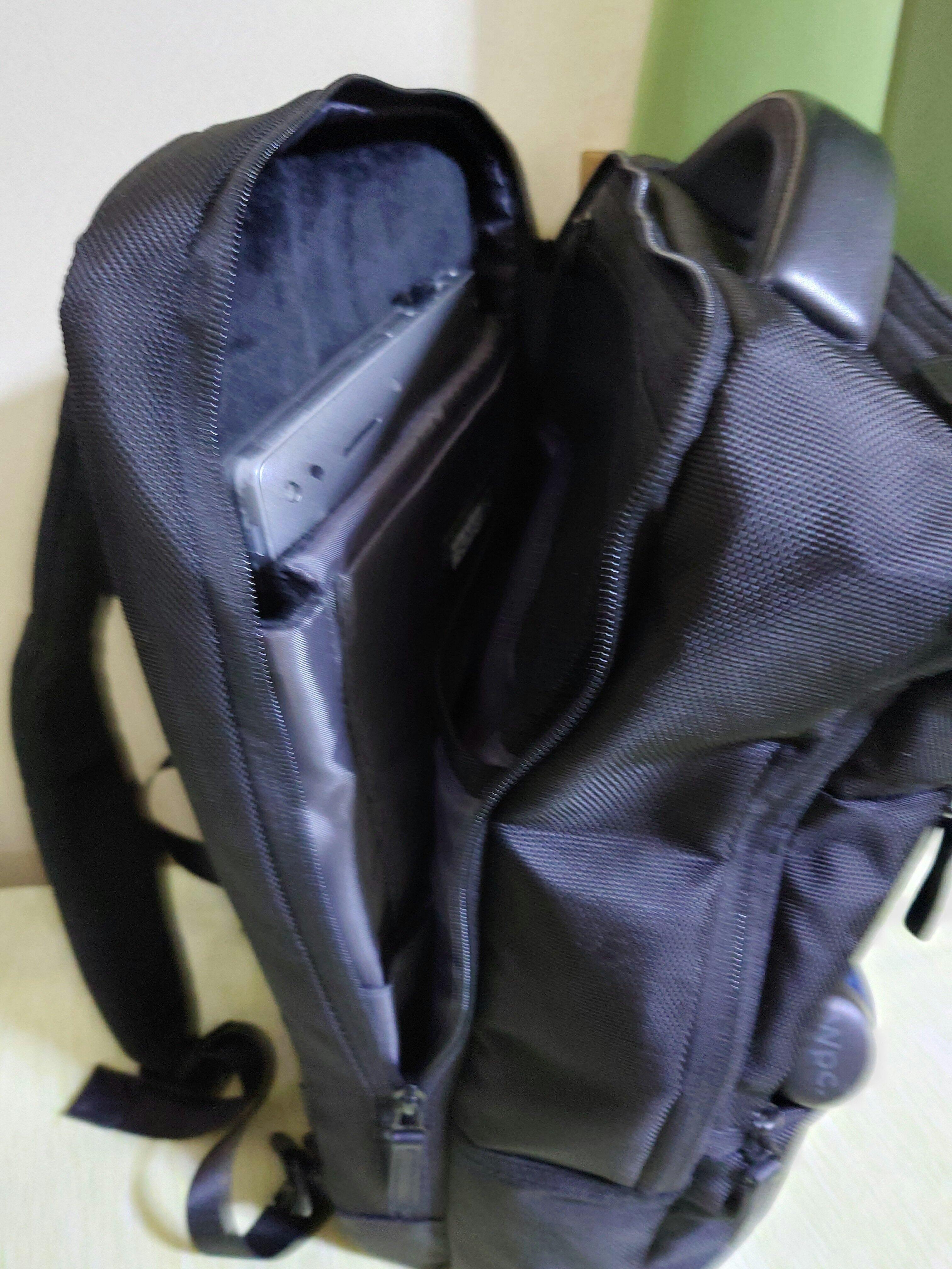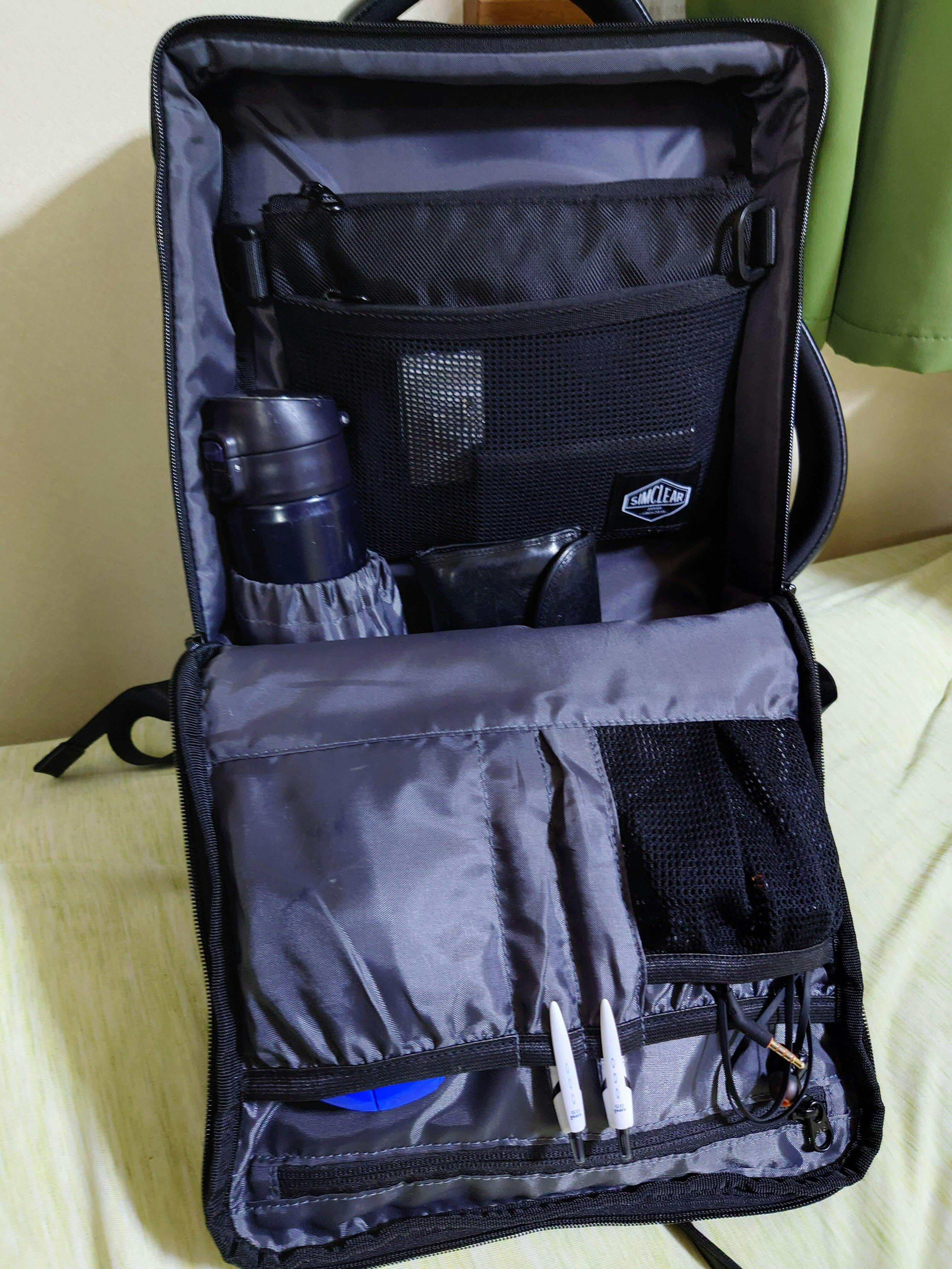 写真の通り、14インチのノートPC、折畳み傘、携帯、サコッシュ(小物や通帳類)、水筒などフル収納の状態でも、以前のかばんより軽量で、なおかつ丈夫で安心感があります