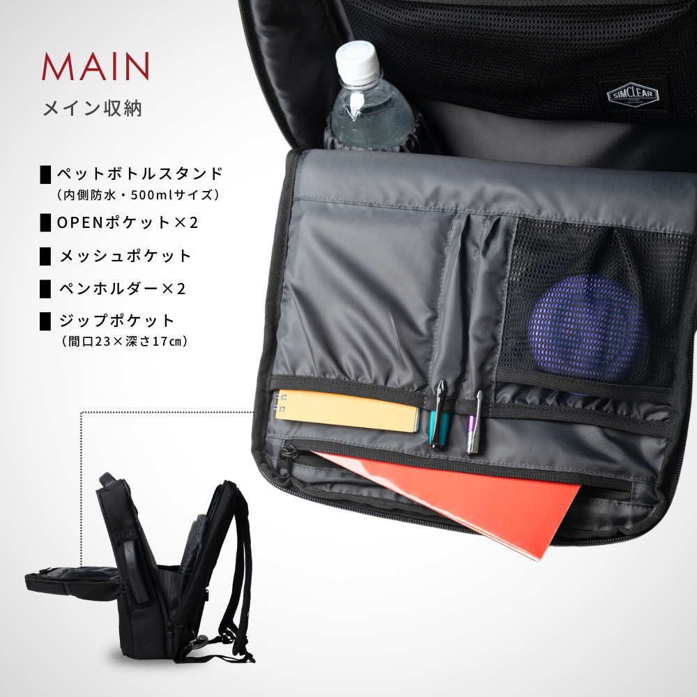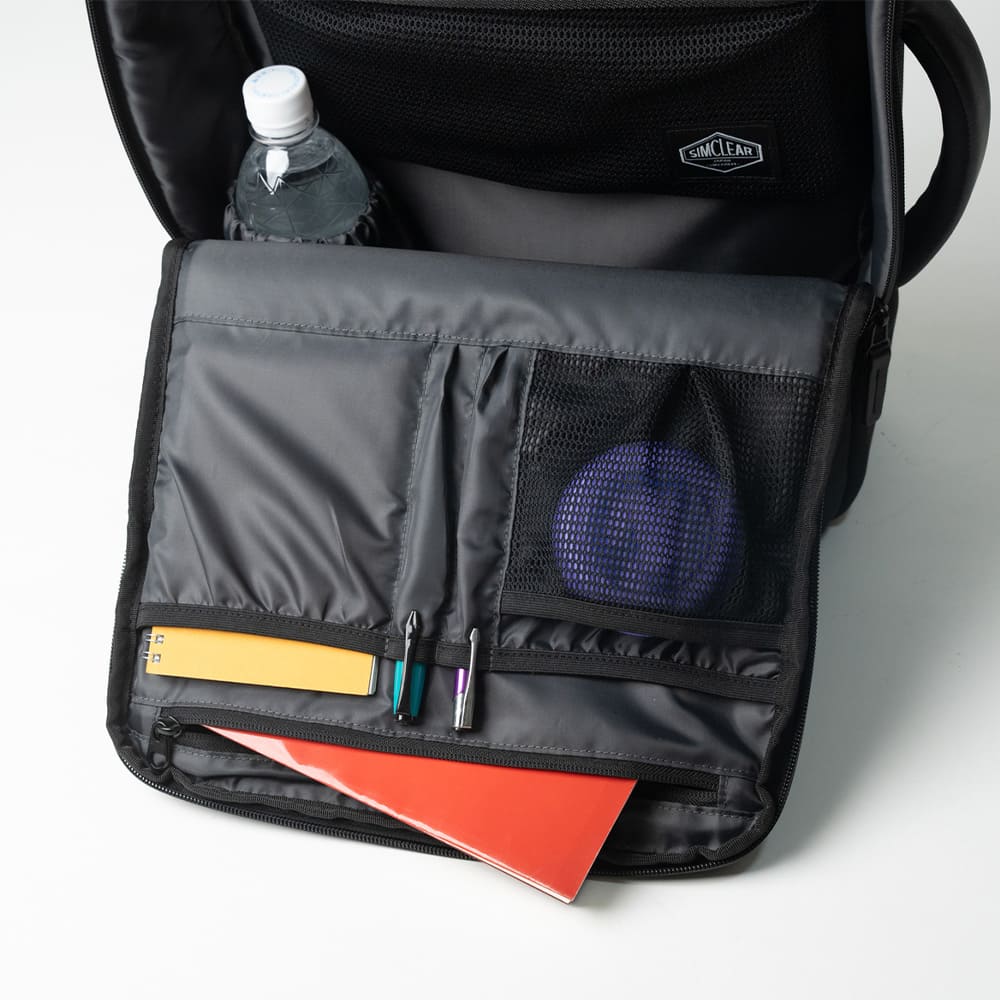 ファスナーポケット、オープンポケット、メッシュポケット、ペンホルダー、ボトルホルダーあり。