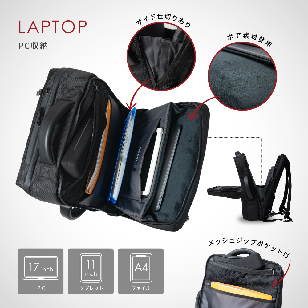 16インチまでのPC、11インチまでのタブレット、A4ファイルが収納できます。